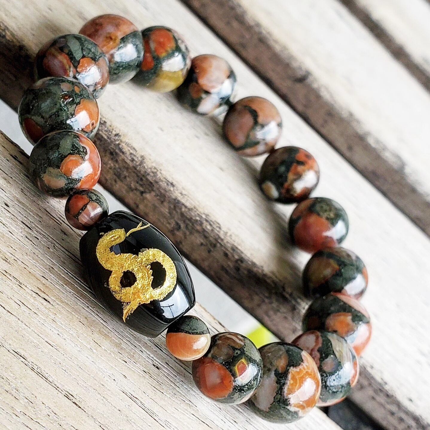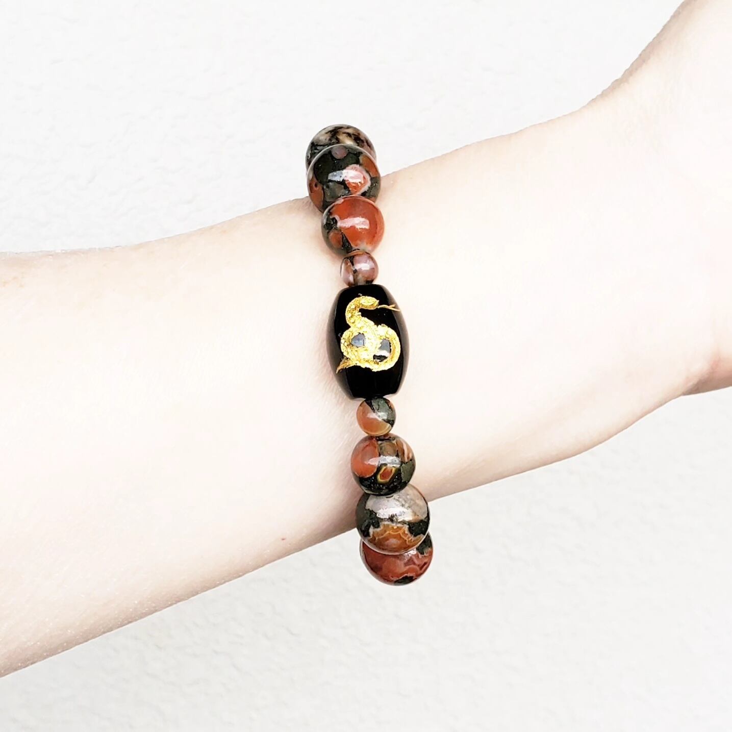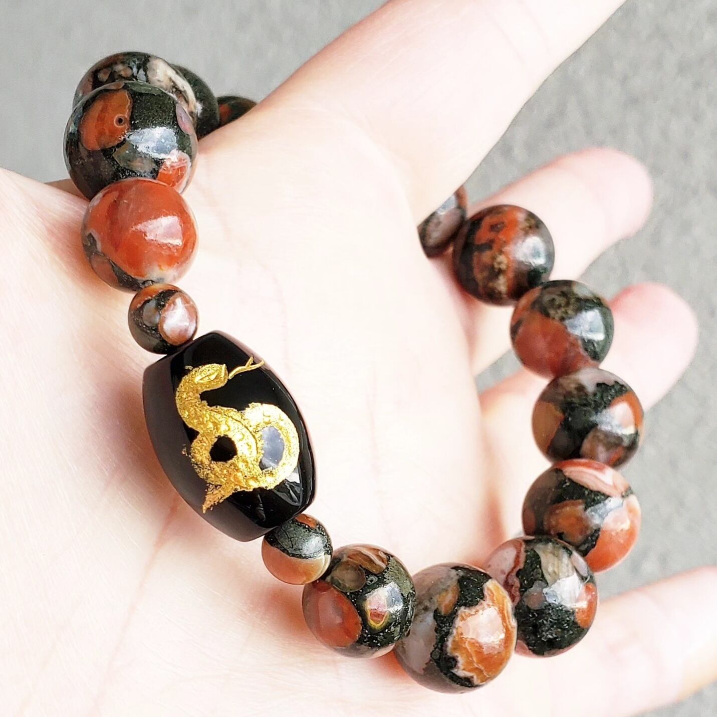 〈大玉〉オニキス(蛇・金色彫り/樽型) × アミグダロイダルアゲート