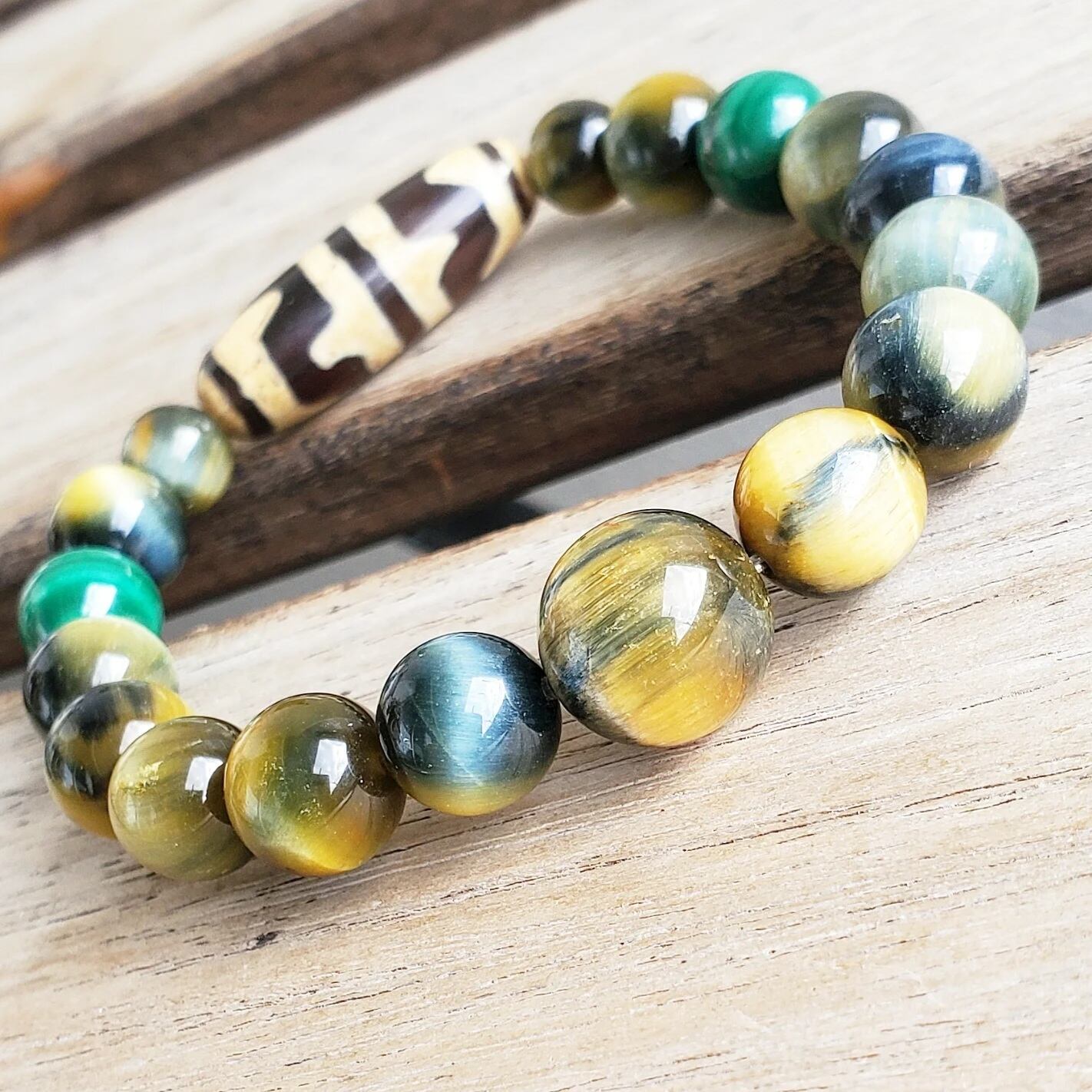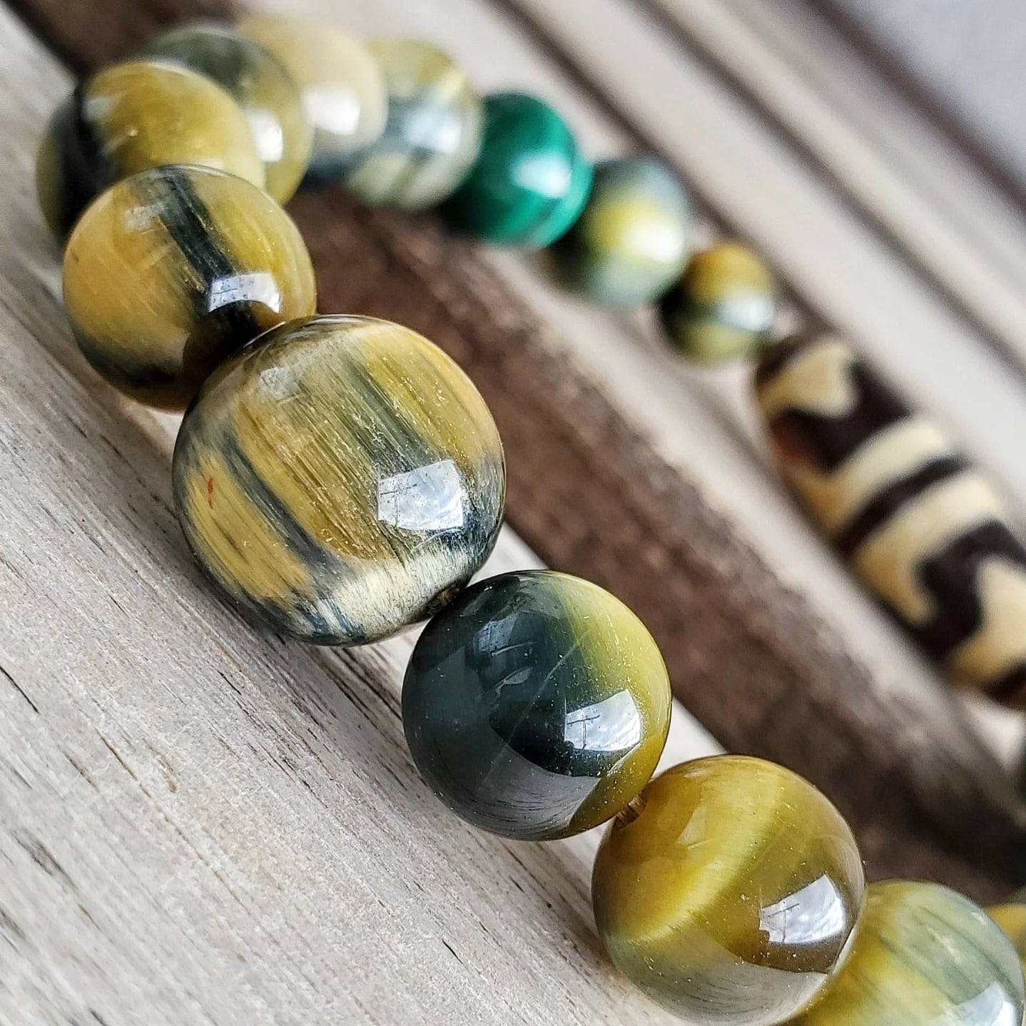 四線虎牙(しせんこが/しせんとらきば)天珠 & イエローブルータイガーアイ & マラカイト