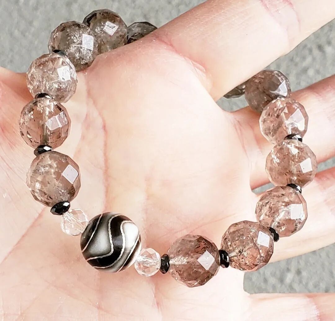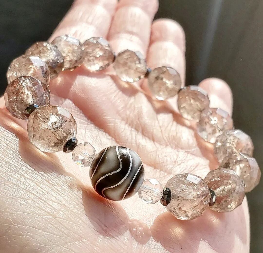 〈大玉〉虎牙(こが/とらきば)天珠[銀線入り] & ヒマラヤマニハール産 アイリス エレスチャルスモーキークォーツ(ミラーボールカット) & ヘマタイト(ボタンカット) & 64面体水晶